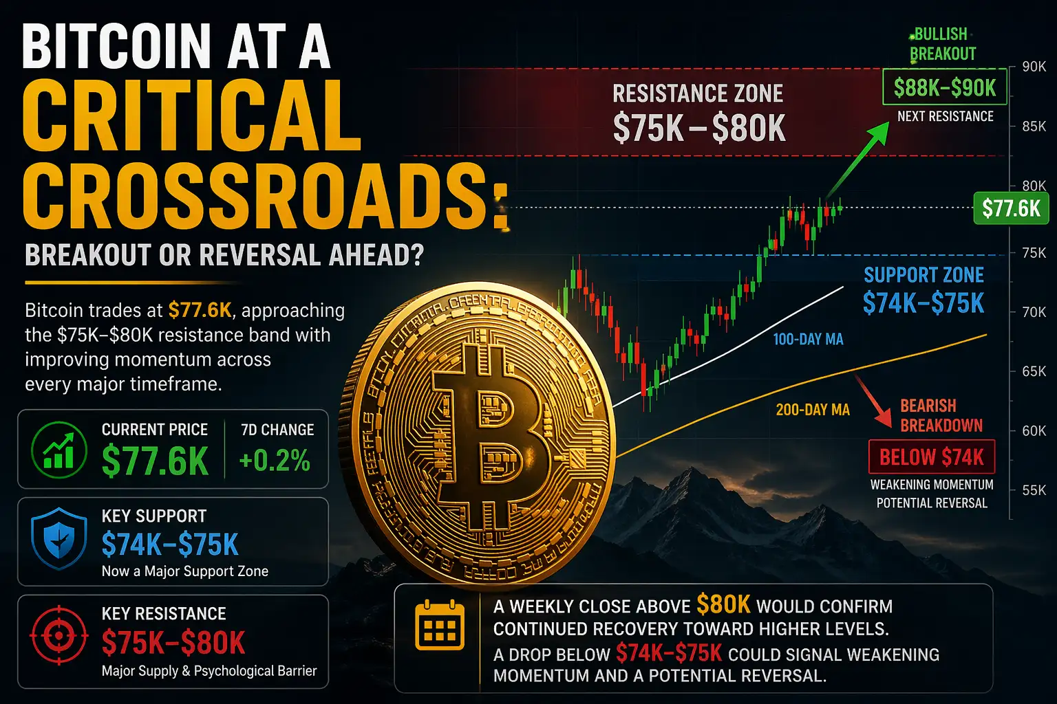 Bitcoin trades near $77.6k as it tests the $80k resistance. Explore On-Chain Media's technical analysis on key support levels and BTC's next major move.